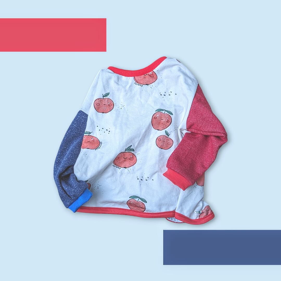 このカットソーは、海外から取り寄せた特別な生地で作られています。左右の袖が異なる色合いでデザインされており、個性的でおしゃれな印象を与えます!特徴的なのは、リンゴに可愛らしい顔が付いているデザインです。